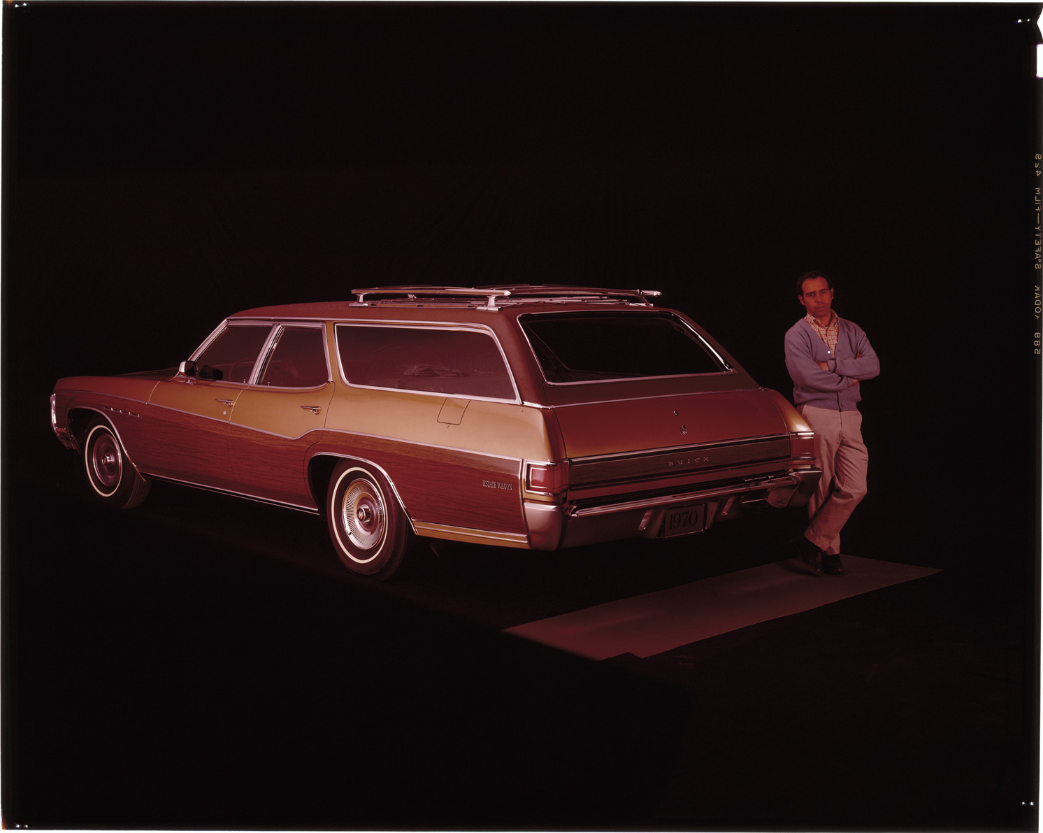 View of a man posing with a 1970 Buick Estate station wagon. Label on sleeve: "General Motors, Buick Estate wagon, 1970."