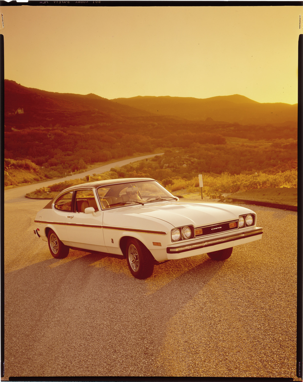 View of a man driving a Mercury Capri coupe. Label on sleeve: "Ford (Europe), Mercury Capri, 1971-77."