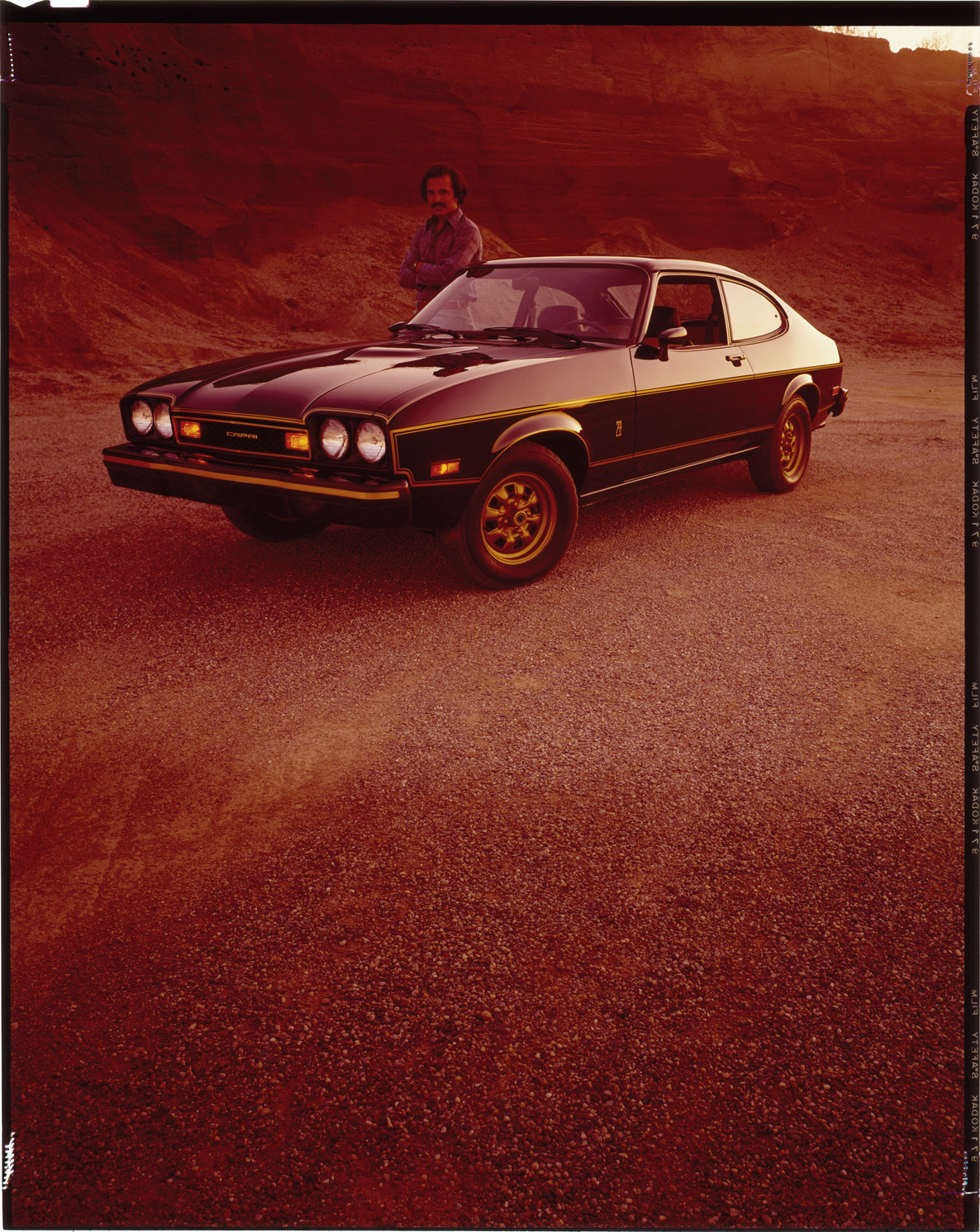 View of a man posing with a Mercury Capri coupe. Label on sleeve: "Ford (Europe), Mercury Capri, 1971-77."