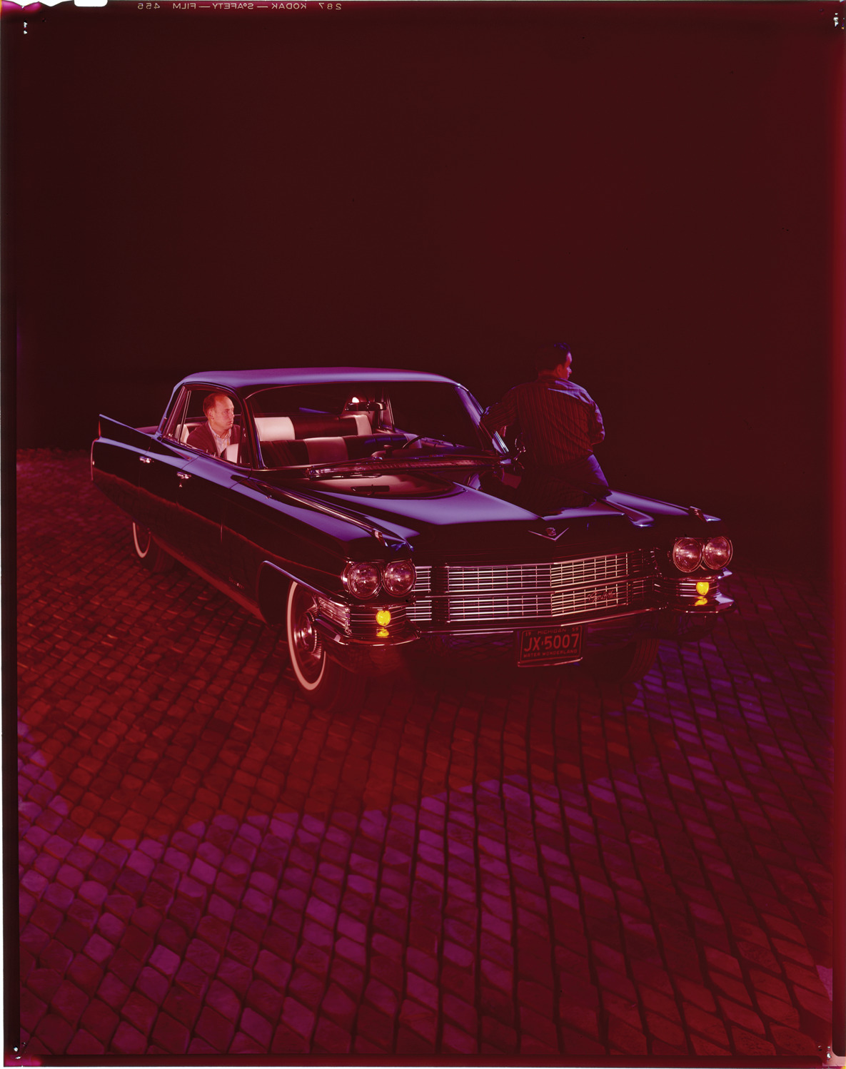 Nighttime view of two men posing with a 1963 Cadillac sedan. Label on sleeve: "General Motors, Cadillac, 1963."