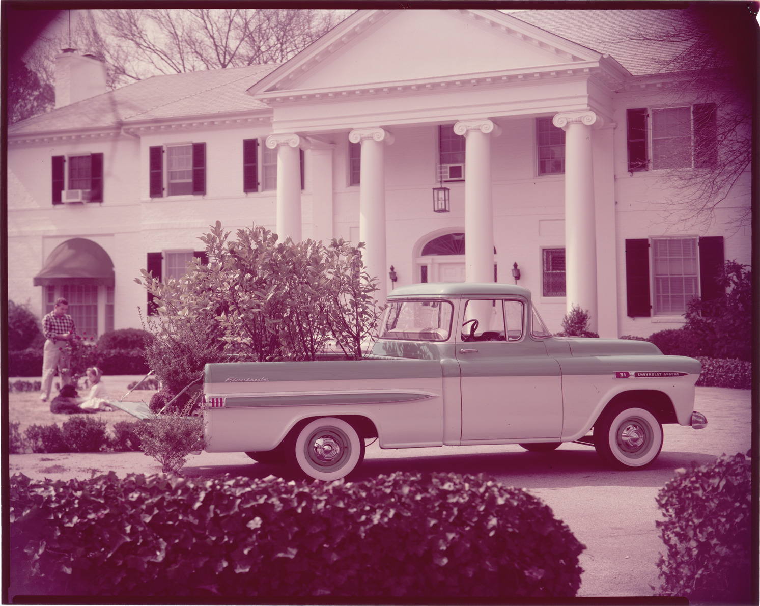 View of a 1959 Chevrolet Apache Fleetside pickup truck. Man, girl and dog on lawn; house in background. Label on sleeve: "General Motors, Chevrolet pickup, 1959."