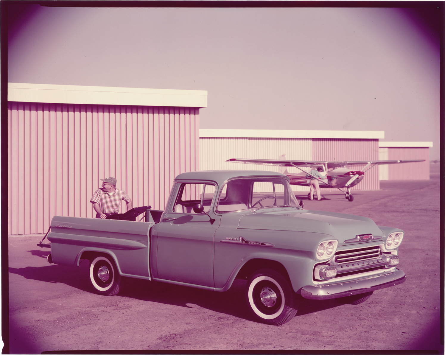 View of a man posing with a 1959 Chevrolet Apache Fleetside pickup truck. Small private plane in background. Label on sleeve: "General Motors, Chevrolet trucks, 1959."