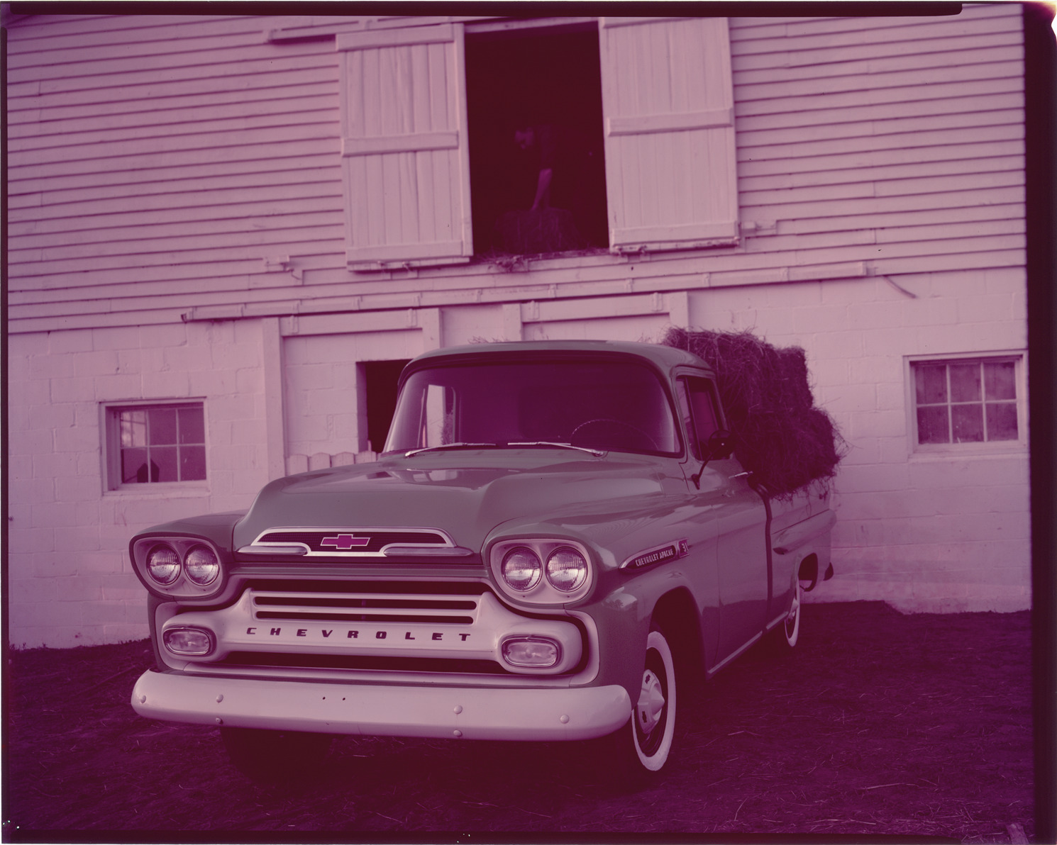 Favorite this☆ 1959 Chevrolet Apache truck Description: View of a farmer loading hay bales into the bed of a 1959 Chevrolet Apache pickup truck. Barn in background. Label on sleeve: "General Motors, Chevrolet pickup, 1959." Details Resource ID: na037145 Creator: Boulevard Photographic (Firm) Subject: Chevrolet trucks Pickup trucks Advertising Transparencies Date Issued: 1959 Format: 1 transparency : col. ; 8 x 10 in. Member of: National Automotive History Collection Mickey McGuire and Jim Northmore Boulevard Photographic Collection Filing Location: Chevrolet trucks, 3:2 Rights: Physical rights are retained by DPL. Copyright is retained in accordance with U.S. copyright laws.