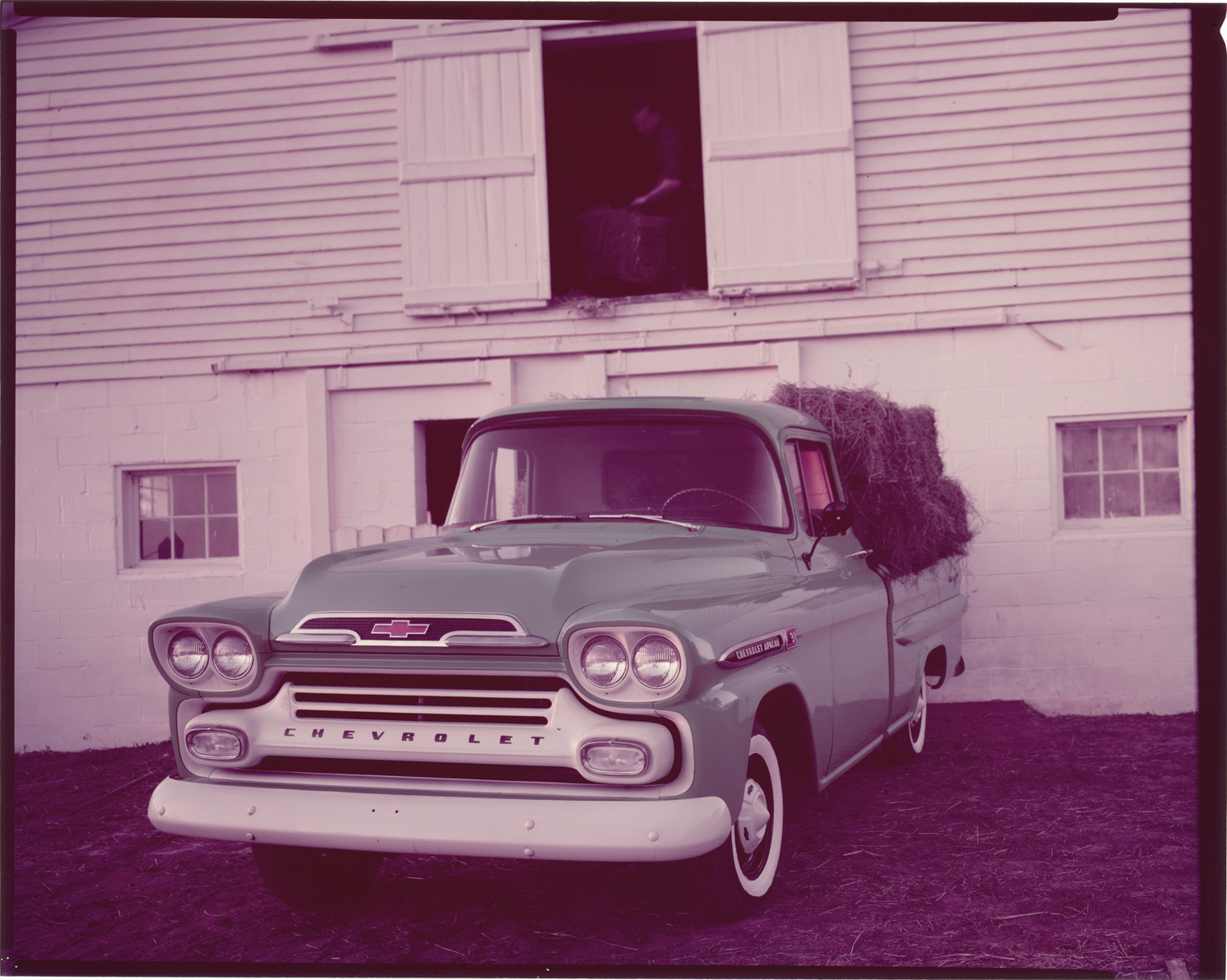 View of a farmer loading hay bales into the bed of a 1959 Chevrolet Apache pickup truck. Barn in background. Label on sleeve: "General Motors, Chevrolet pickup, 1959."