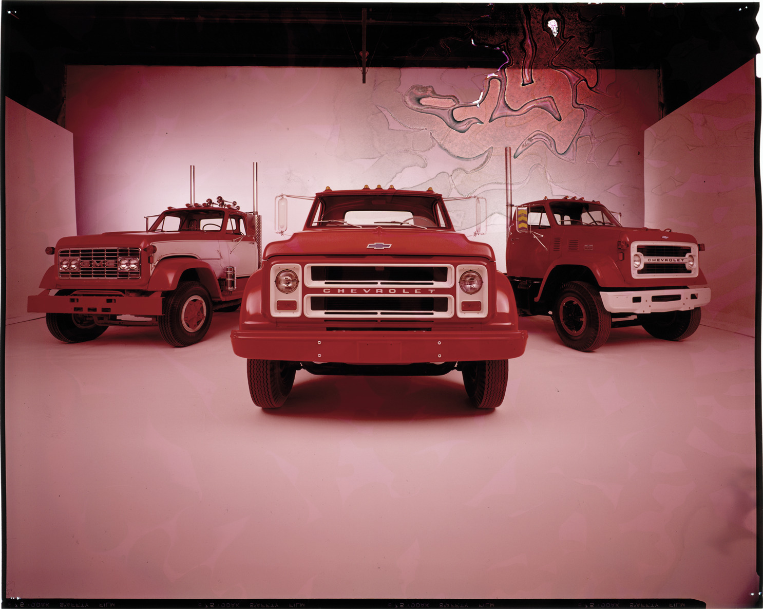 View of three Chevrolet truck cabs. Label on sleeve: "General Motors, Chevrolet trucks, 1970s."