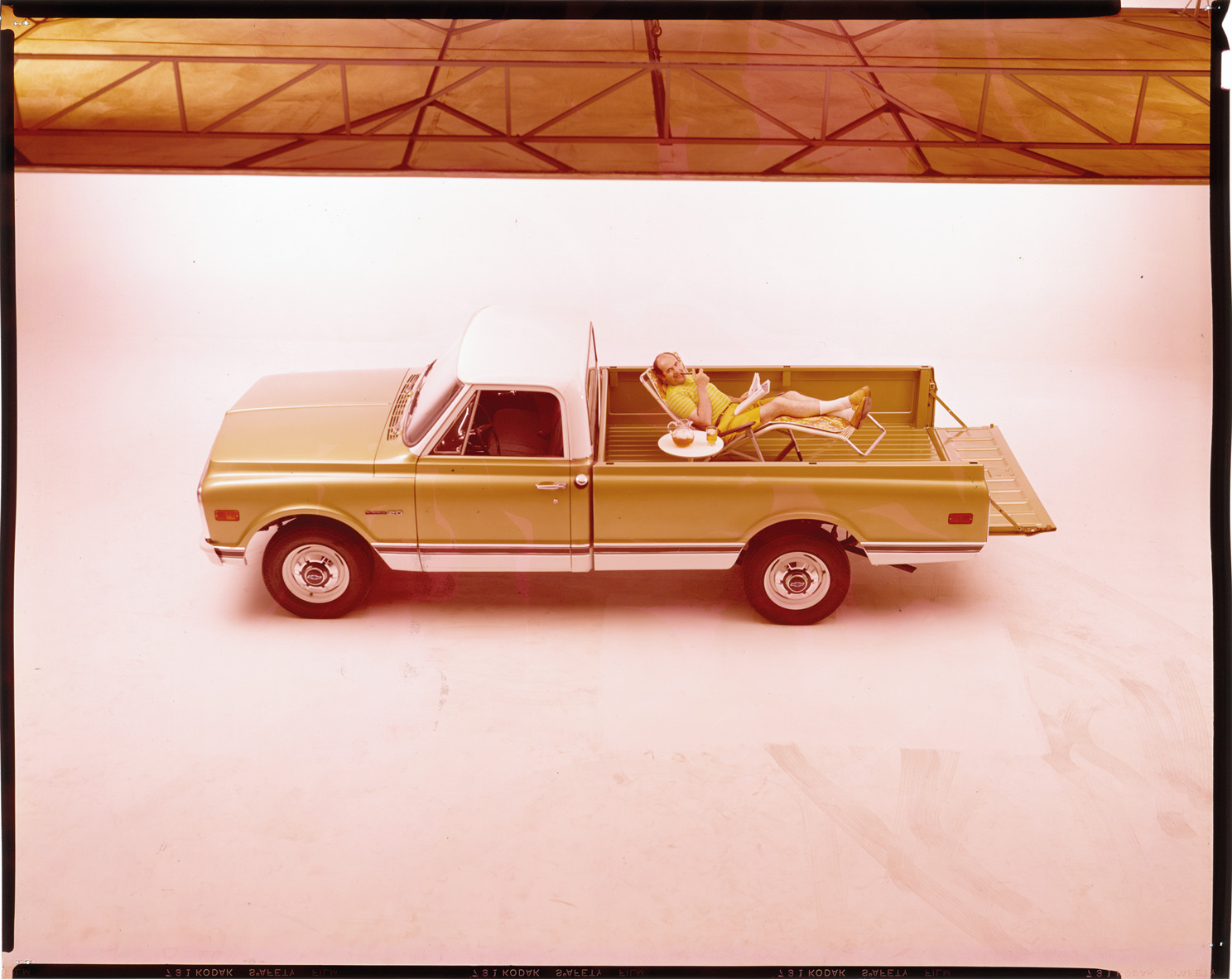 Favorite this☆ 1970 Chevrolet truck Description: View of a man relaxing with a pipe, newspaper and iced tea on a chaise lounge in the bed of a 1970 Chevrolet pickup truck. Label on sleeve: "General Motors, Chevrolet pickup, 1970." Details Resource ID: na037180 Creator: Boulevard Photographic (Firm) Subject: Chevrolet trucks Pickup trucks Advertising Transparencies Date Issued: 1970 Format: 1 transparency : col. ; 8 x 10 in. Member of: National Automotive History Collection Mickey McGuire and Jim Northmore Boulevard Photographic Collection Filing Location: Chevrolet trucks, 3:4 Rights: Physical rights are retained by DPL. Copyright is retained in accordance with U.S. copyright laws.