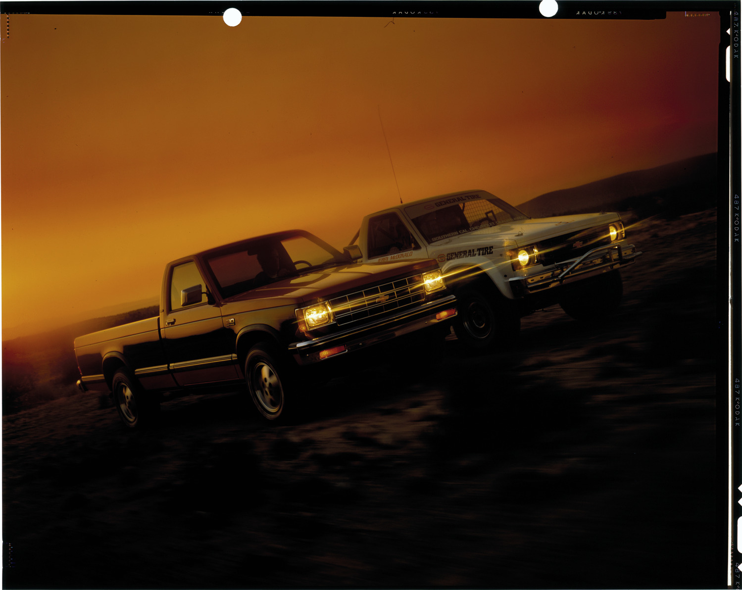 View of two Chevrolet S10 pickup trucks. Label on sleeve: "General Motors, Chevrolet pickup S10, 1980s."