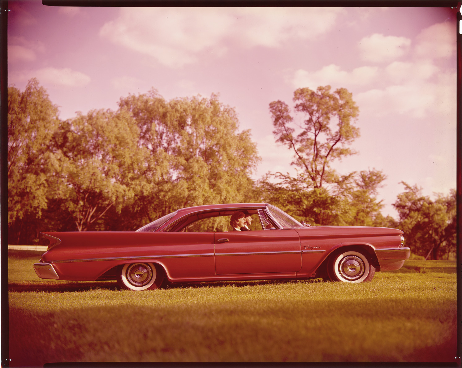 View of a man and woman posing in a 1960 Chrysler coupe. Label on sleeve: "Chrysler Corporation, Chrysler, 1960."