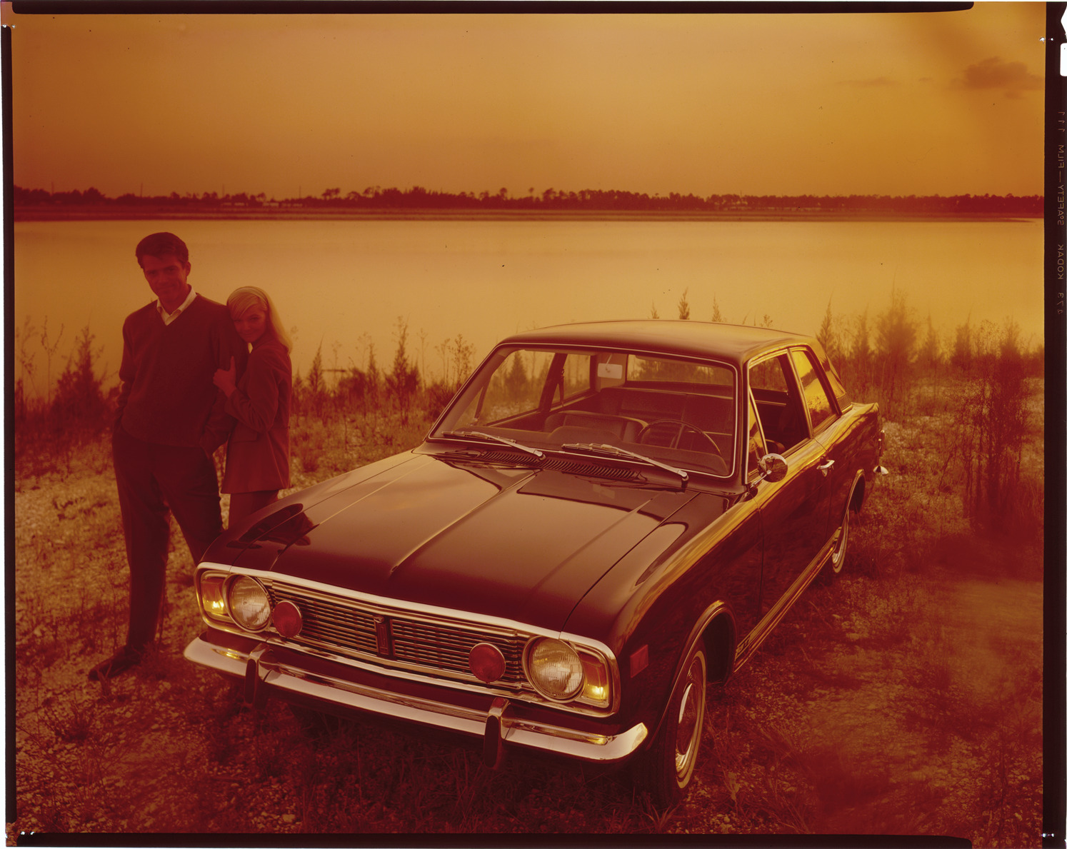 View of a man and woman posing with a 1969 Ford Cortina Mark II coupe. Label on sleeve: "Ford (British), Ford Cortina Mark II, 1969."