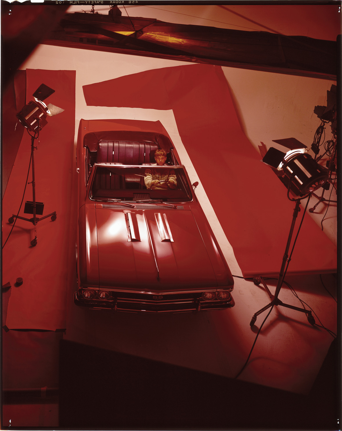 Overhead view of a man posing in a 1966 Chevrolet Chevelle SS convertible. Label on sleeve: "General Motors, Chevrolet Chevelle SS, 1966."