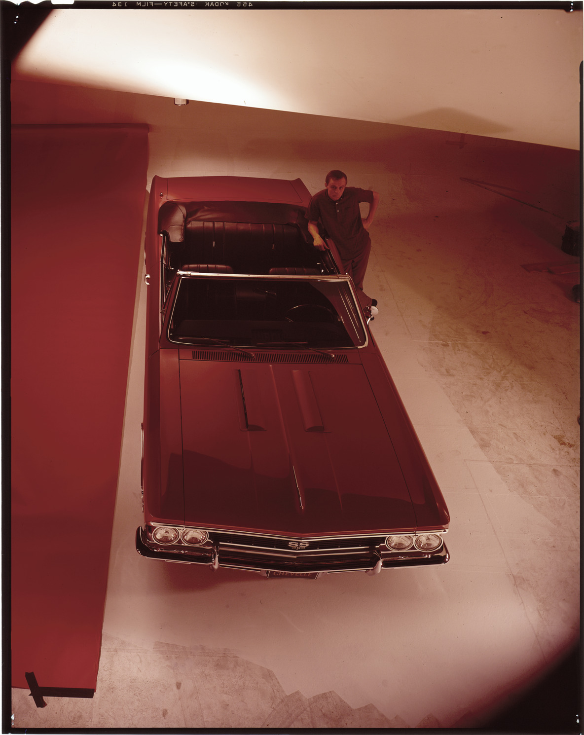 Overhead view of a man posing with a 1966 Chevrolet Chevelle SS convertible. Label on sleeve: "General Motors, Chevrolet Chevelle SS, 1966."