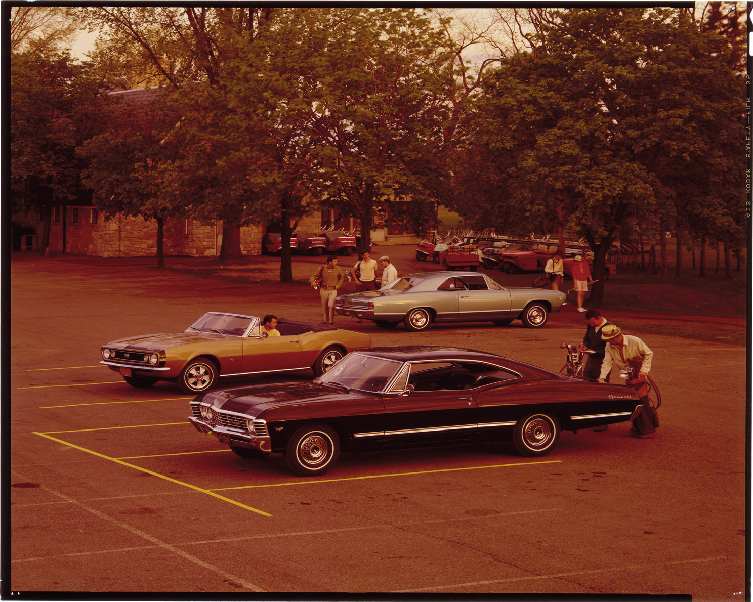 View of golfers in parking lot with a 1967 Chevrolet Impala coupe, 1967 Chevrolet Malibu coupe and a 1967 Chevrolet Camaro convertible. Golf course in background. Label on sleeve: "General Motors, Chevrolet Camaro, Malibu, 1967."