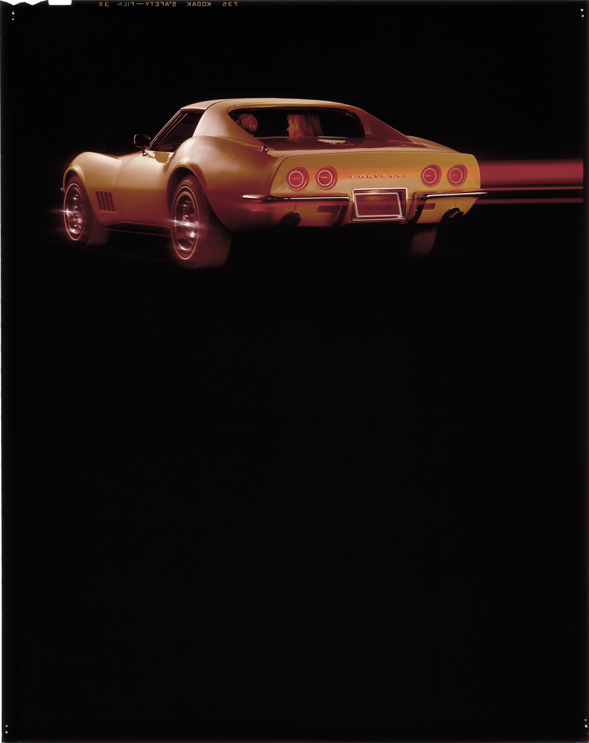 View of a 1968 Chevrolet Corvette coupe. Label on sleeve: "General Motors, Chevrolet Corvette, 1968."
