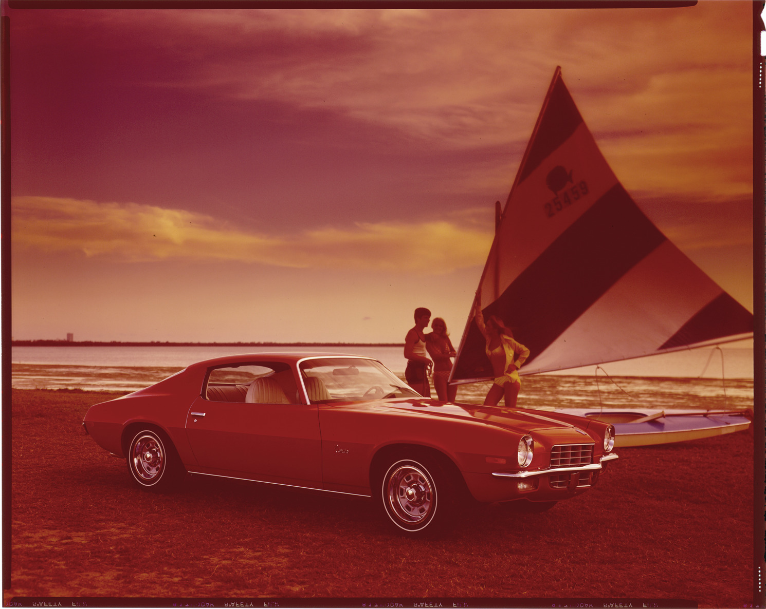 View of a man and two women posing with a 1973 Chevrolet Camaro coupe on beach. Sailboat in background. Label on sleeve: "General Motors, Chevrolet Camaro, 1973."