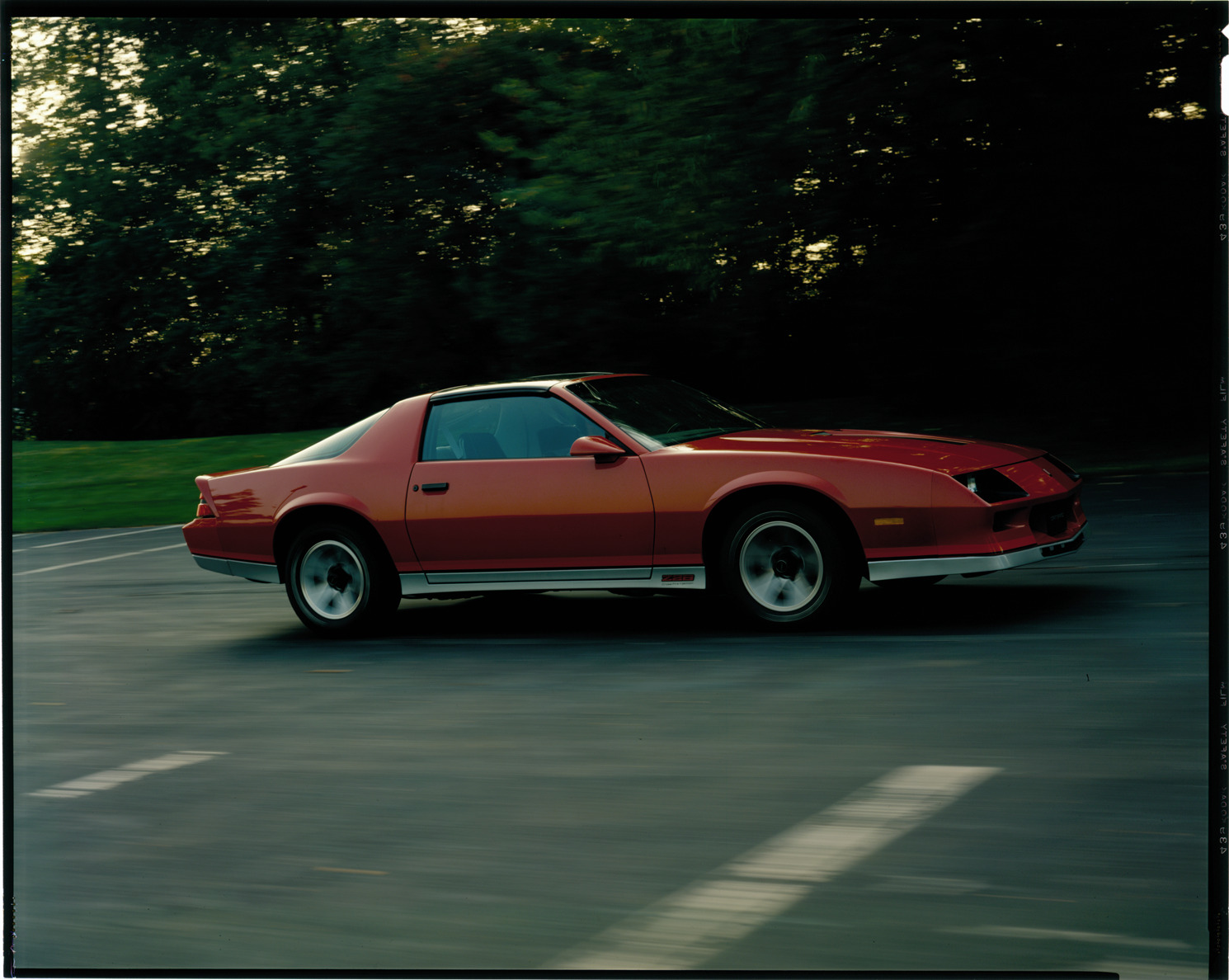 View of a 1983 Chevrolet Camaro Z28 coupe. Label on sleeve: "General Motors, Chevrolet Camaro Z28, 1983."