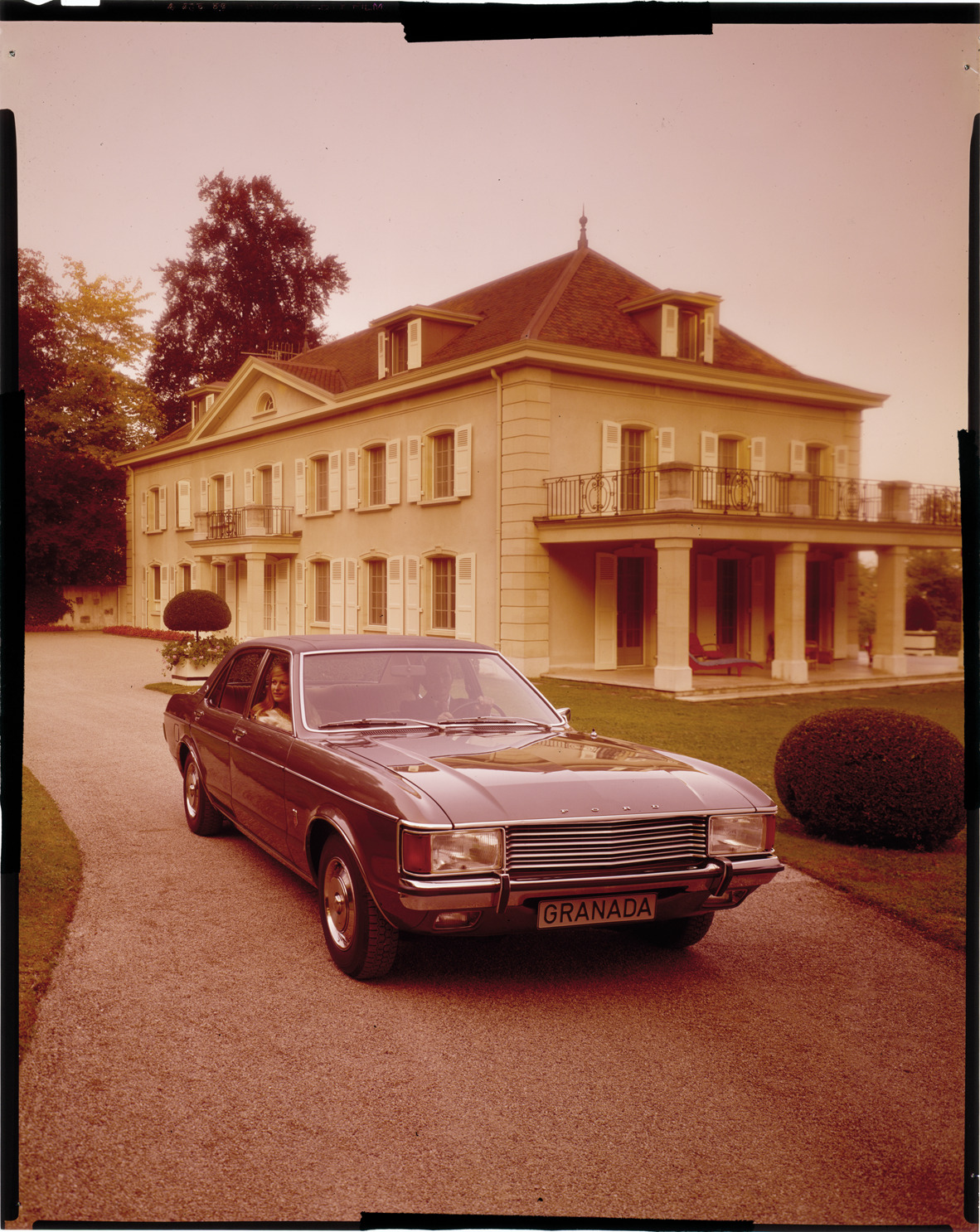 View of a man and woman posing in a Ford Granada sedan. House in background. Label on sleeve: "Ford British, Granada, 1970s."