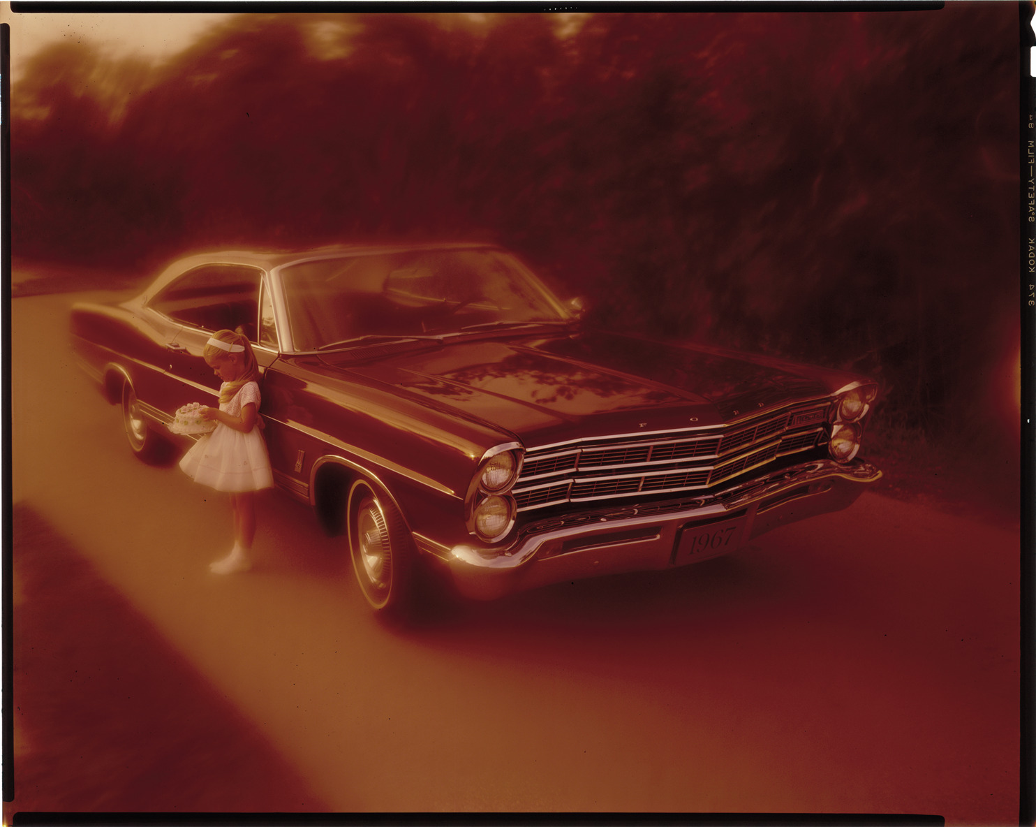 View of a young girl, holding a birthday cake, posing with a 1967 Ford Galaxie coupe. Label on sleeve: "Ford Motor Co., Ford hdtp. Galaxie, 1967."