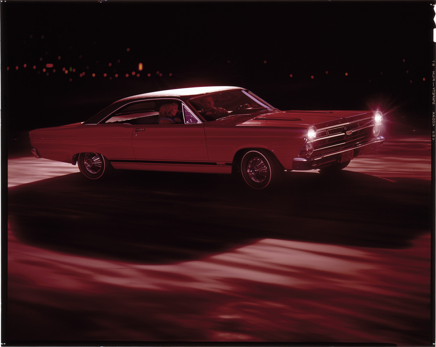 View of a man and woman posing in a 1967 Ford Fairlane GT coupe. Label on sleeve: "Ford Motor Co., Ford Fairlane GT, 1967."