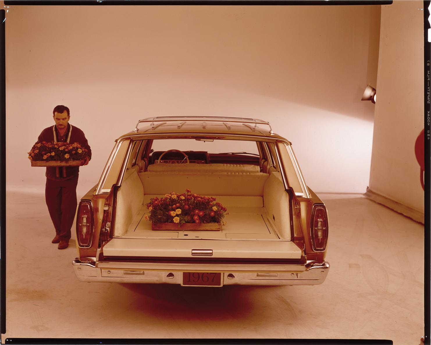 View of a man loading flats of marigolds into a 1967 Ford station wagon; car has open tailgate, showing interior. Label on sleeve: "Ford Motor Co., Ford wagon, 1967."