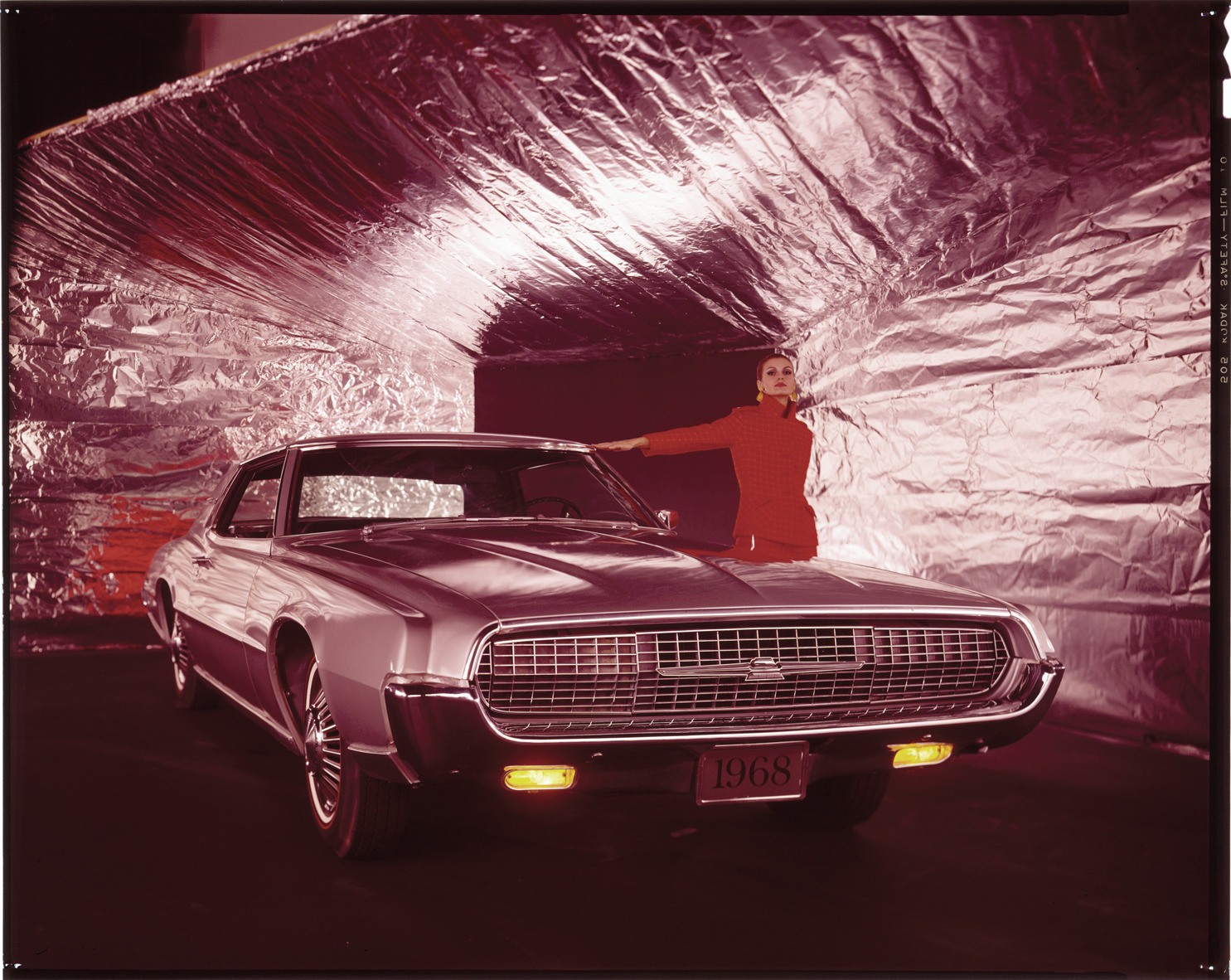 View of a woman posing with a 1968 Ford Thunderbird coupe. Label on sleeve: "Ford Motor Co., Ford Thunderbird, 1968."