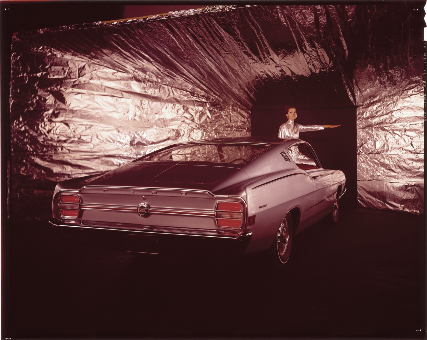 View of a woman posing with a 1968 Ford Torino coupe. Label on sleeve: "Ford Motor Co., Ford Torino, 1968."