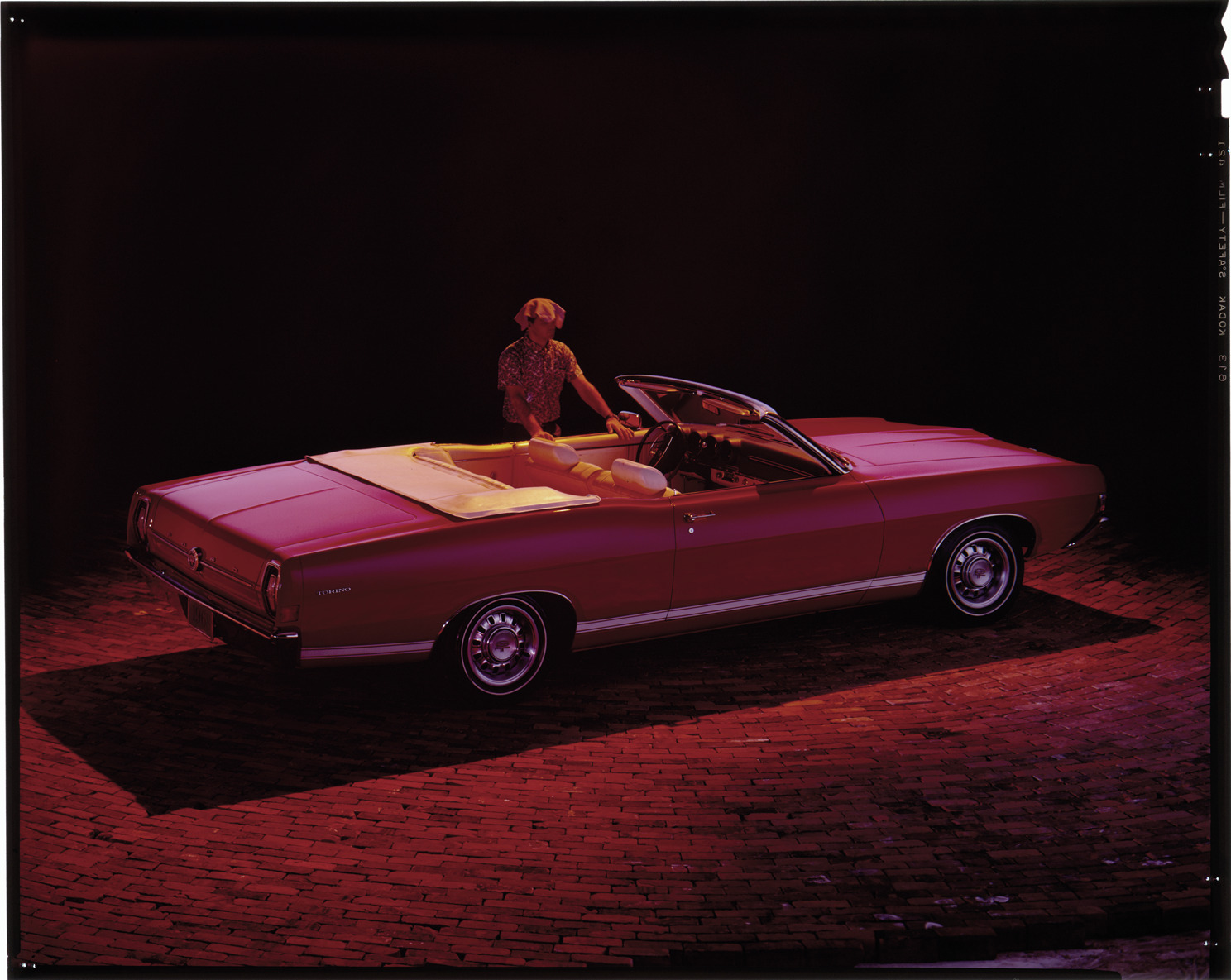 View of a man posing with a 1968 Ford Torino convertible. Label on sleeve: "Ford Motor Co., Ford Torino convertible, 1968."