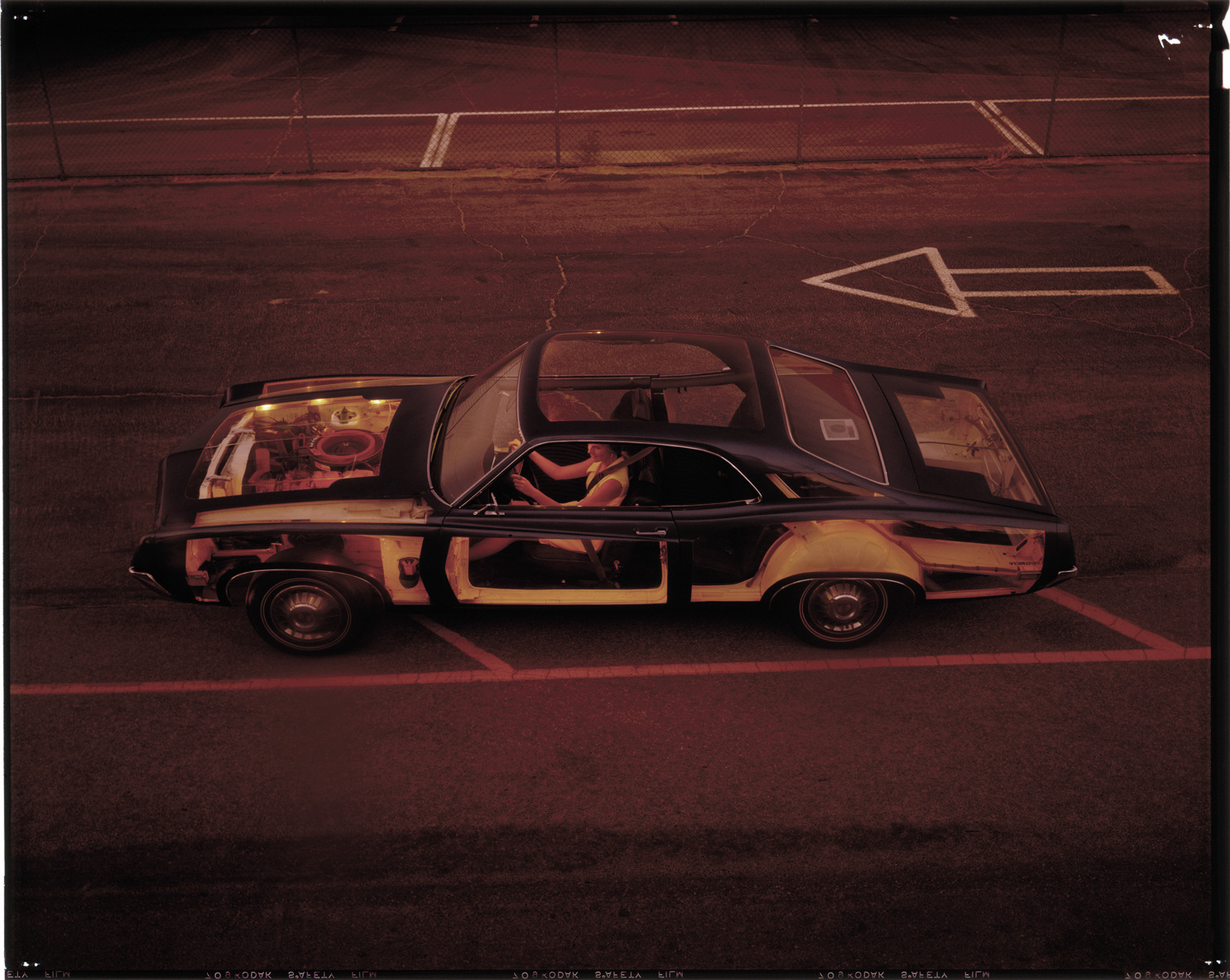 View of a woman posing in a transparent 1971 Ford Torino coupe, which shows engine and interior. Label on sleeve: "Ford Motor Co., Ford Torino advertising, 1971."