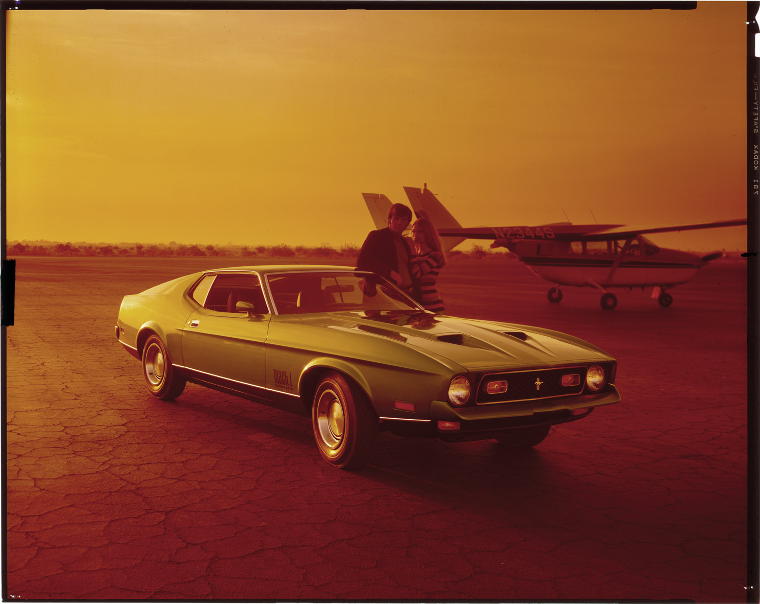 View of a man and woman posing with a Ford Mustang coupe. Private jet in background. Label on sleeve: "Ford Motor Co., Ford Mustang, 1971-72."