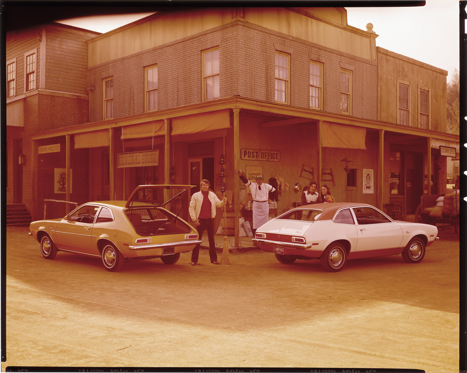 Favorite this☆ 1972 Ford Pinto automobiles Description: View of three men and a woman posing with two 1972 Ford Pinto coupes. Old West general store and post office on set in background. Label on sleeve: "Ford Motor Co., Ford Pinto, 1972." Details Resource ID: na037852 Creator: Boulevard Photographic (Firm) Subject: Pinto automobile Advertising--Automobiles Transparencies Date Issued: 1972 Format: 1 transparency : col. ; 8 x 10 in. Member of: National Automotive History Collection Mickey McGuire and Jim Northmore Boulevard Photographic Collection Filing Location: Ford, 7:10 Rights: Physical rights are retained by DPL. Copyright is retained in accordance with U.S. copyright laws.