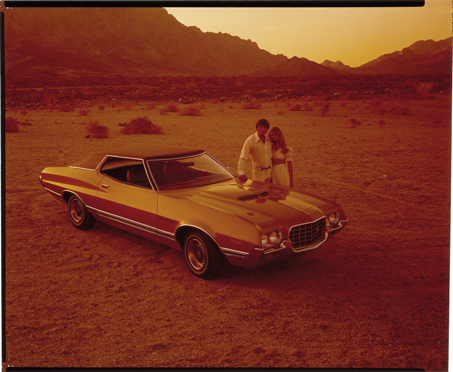View of a man and woman posing with a 1972 Ford Torino coupe. Label on sleeve: "Ford Motor Co., Ford Torino, 1972."