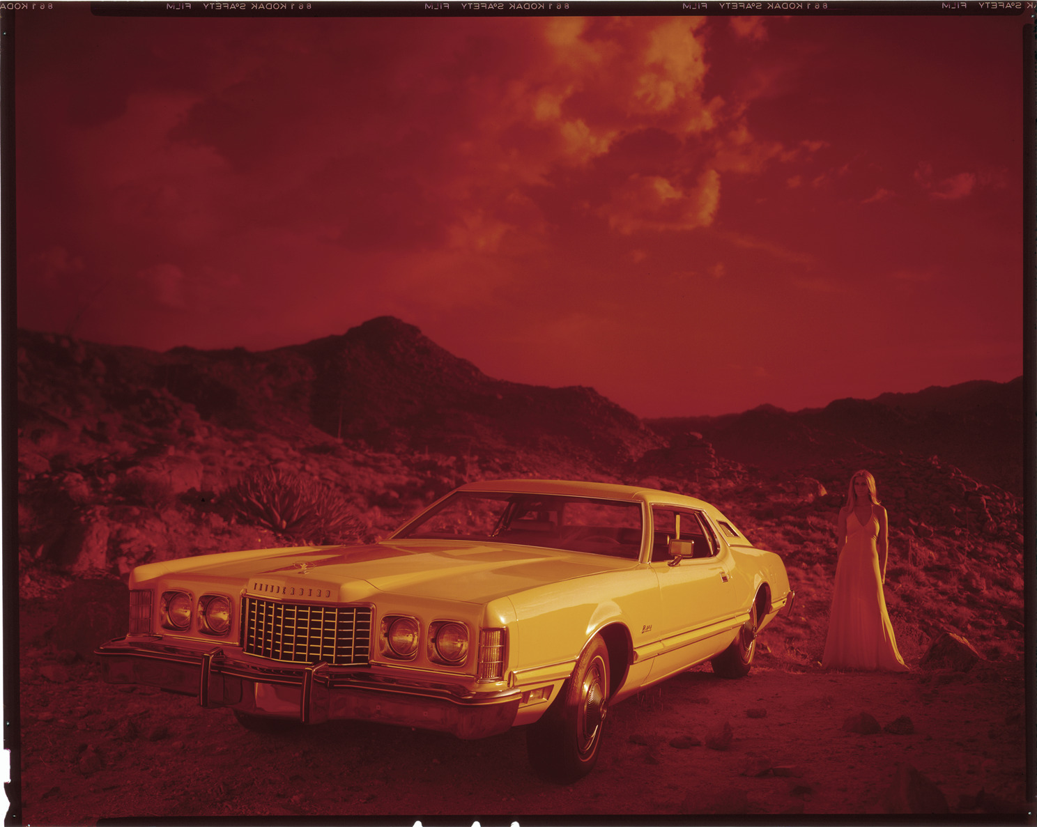 View of a woman posing with a Ford Thunderbird coupe. Label on sleeve: "Ford Motor Co., Ford Thunderbird, 1973-76."