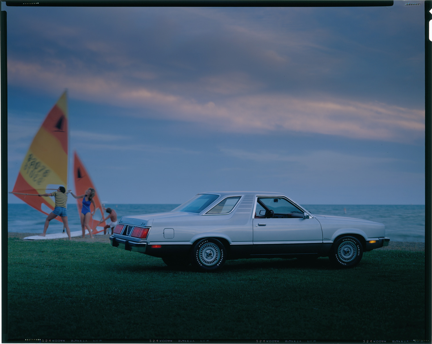 View of a 1979 Ford Futura Sport coupe. Two men and a woman with Sunfish sailboat in background. Label on sleeve: "Ford Motor Co., Ford Futura Sport coupe, 1979."