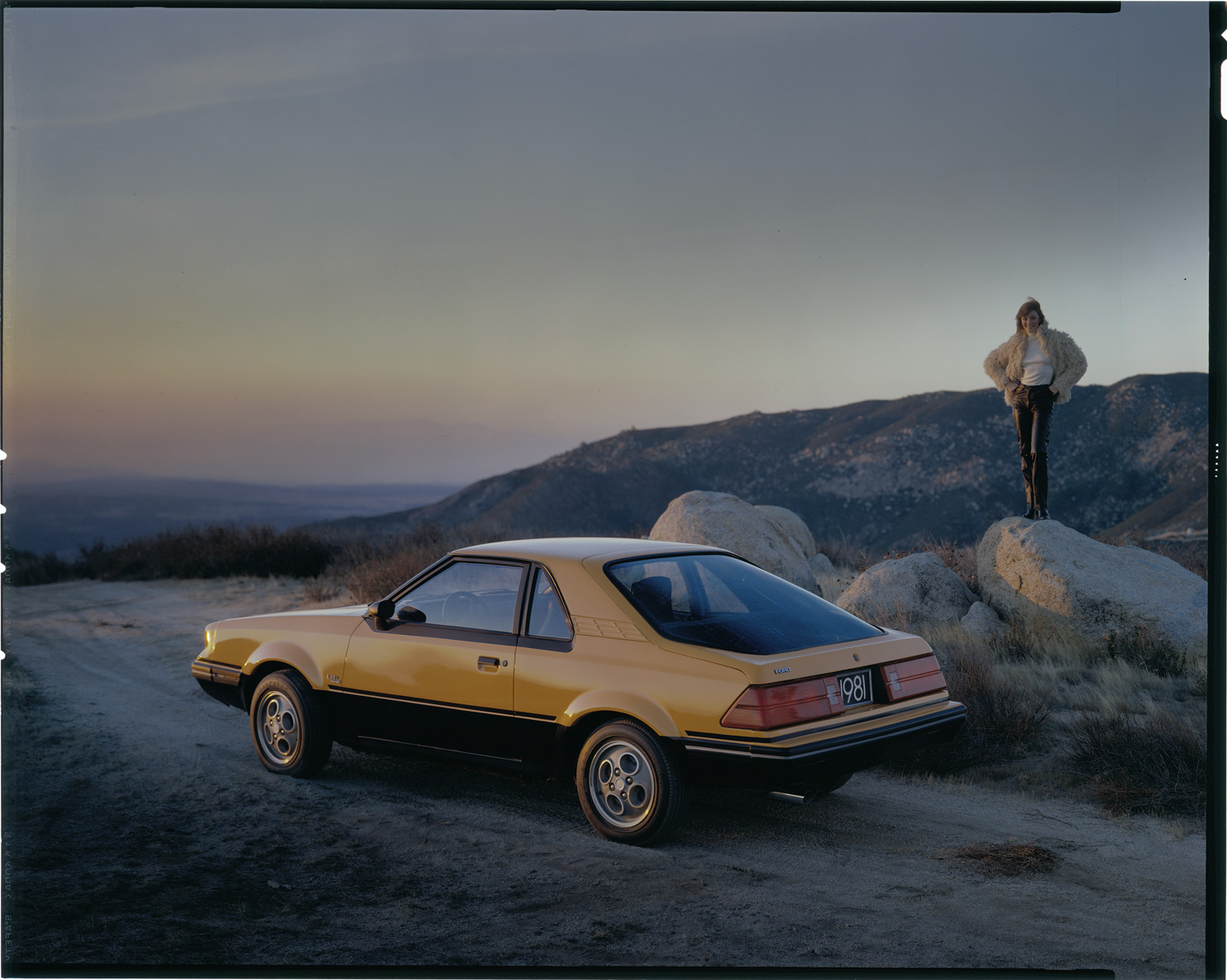 View of a woman posing with a 1982 Ford EXP coupe. Label on sleeve: "Ford Motor Co., Ford EXP, 1982."