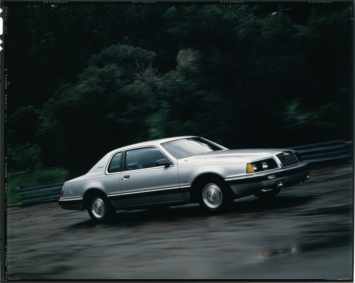 View of a man and woman in a Ford Thunderbird coupe. Label on sleeve: "Ford Motor Co., Ford Thunderbird, 1983-85."