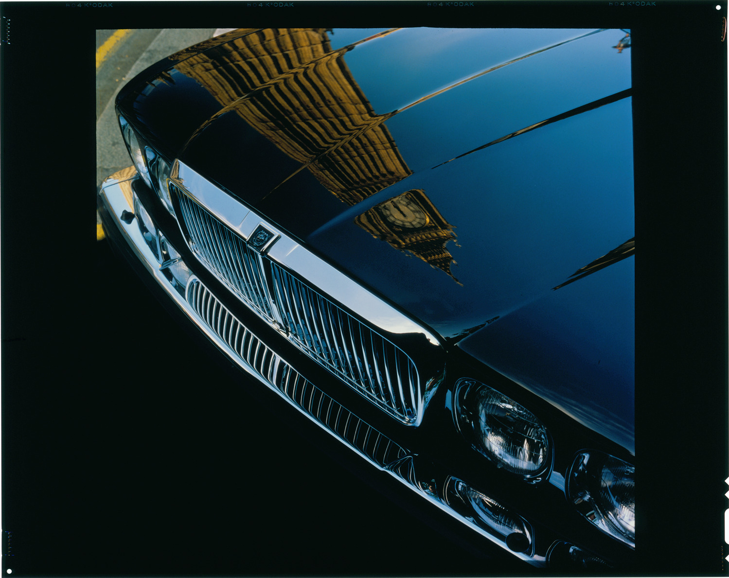Close-up view of the front of end of a Jaguar automobile, showing grille and headlights. Big Ben clock tower is reflected on hood. Label on sleeve: "Jaguar, front end, date unknown."