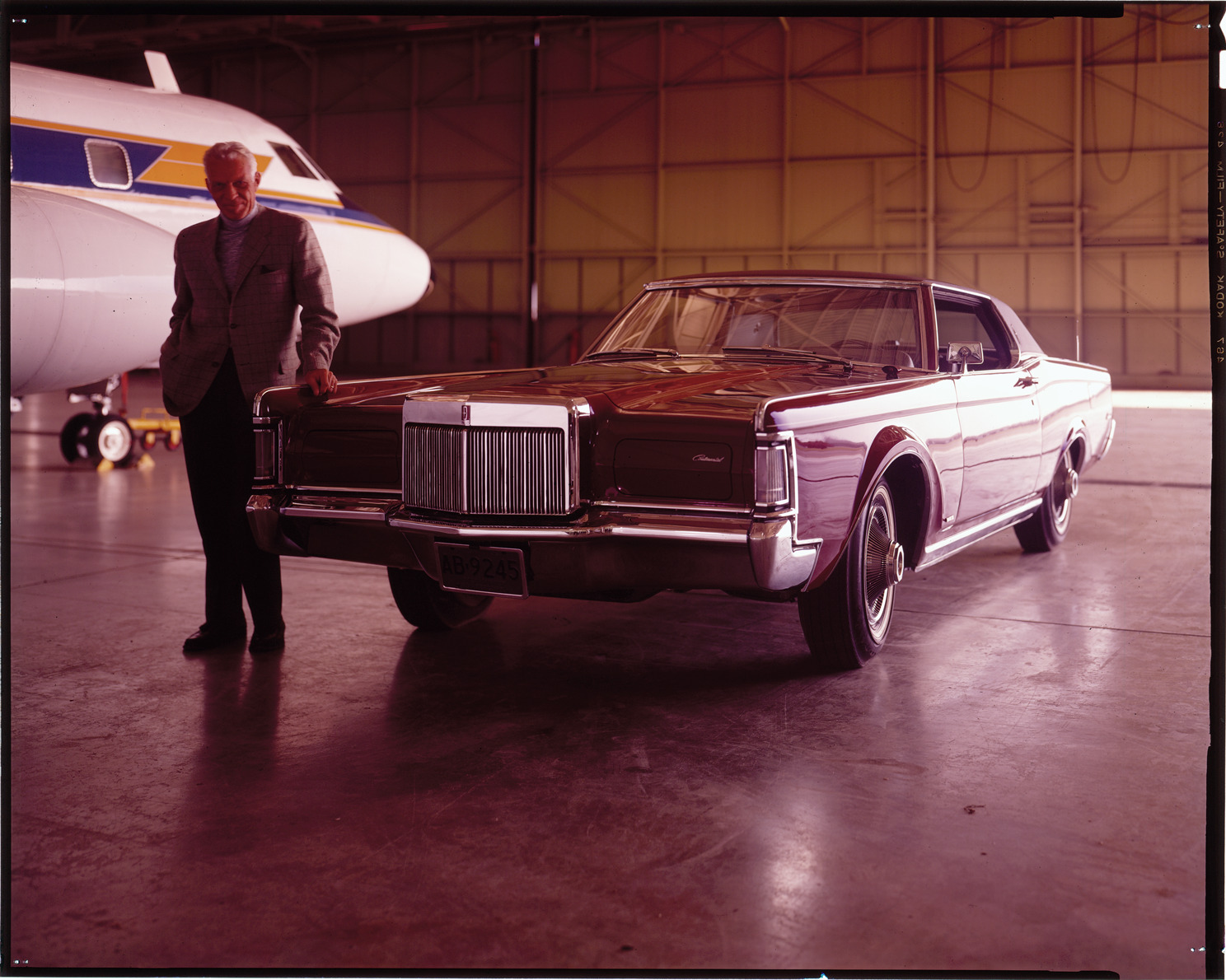View of a man posing with a Lincoln Continental Mark III coupe in an airplane hangar. Plane in background. Label on sleeve: "Ford Motor Co., Lincoln Mark III, 1968-71."