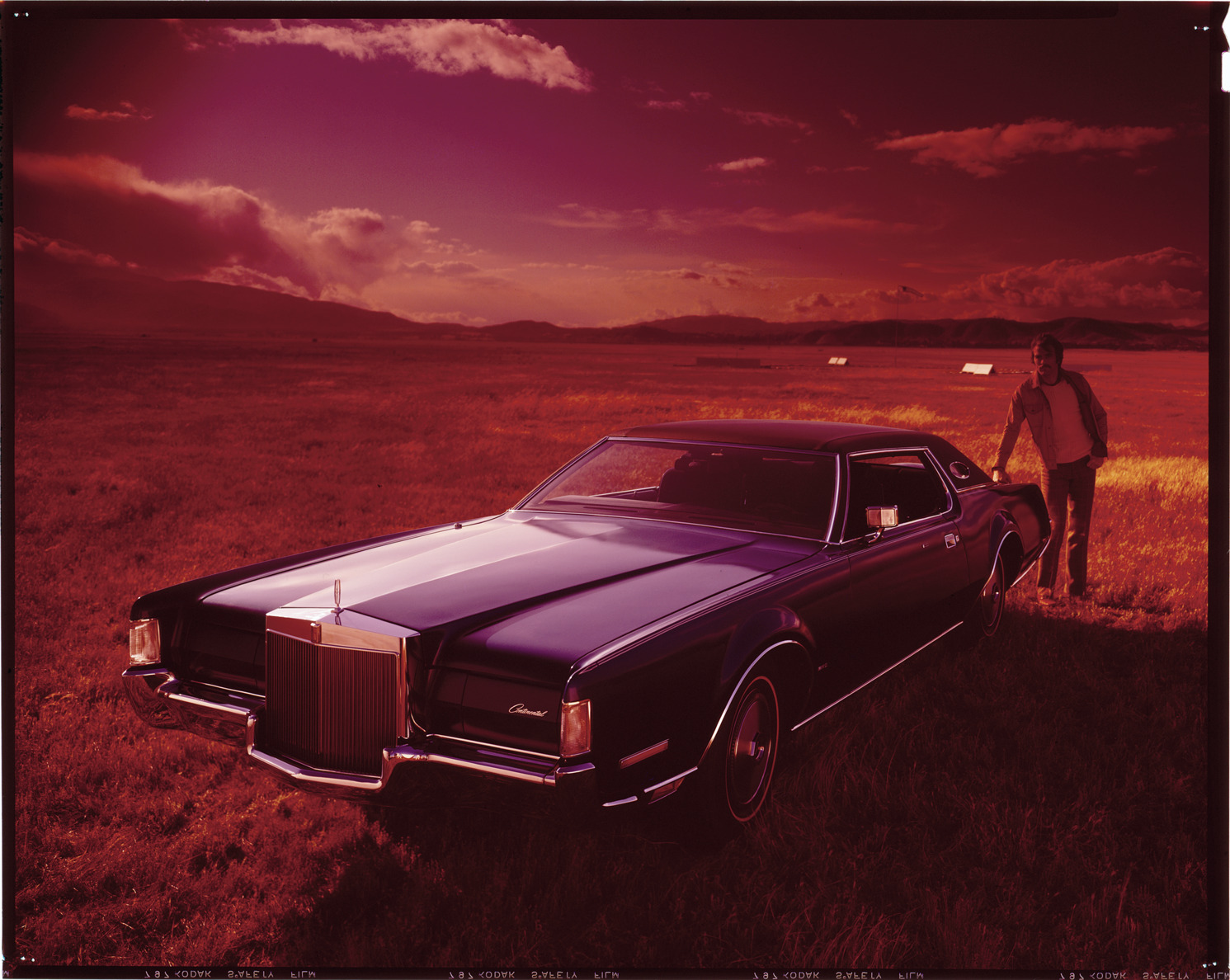 View of a man posing with a Lincoln Continental Mark IV coupe. Label on sleeve: "Ford Motor Co., Lincoln Continental IV, 1972-74."