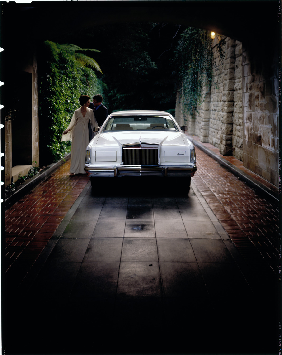 Front view of a Lincoln Continental Mark V coupe, with a man and woman posing next to the car. Label on sleeve: "Ford Motor Co., Lincoln Continental Mark V, 1977-79."