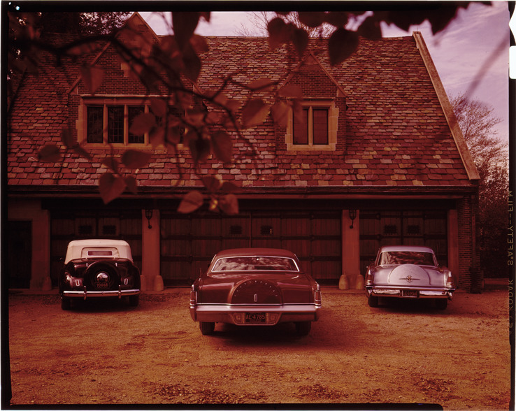 Rear view of a 1941 Lincoln Continental, a 1968 Lincoln Mark III and a 1956 Lincoln Mark II, parked in front of a garage. Label on sleeve: "Ford Motor Co., 1. Lincoln Continental, 1941. 2. Lincoln Mark III, 1968. 3. Lincoln Mark II, 1956."