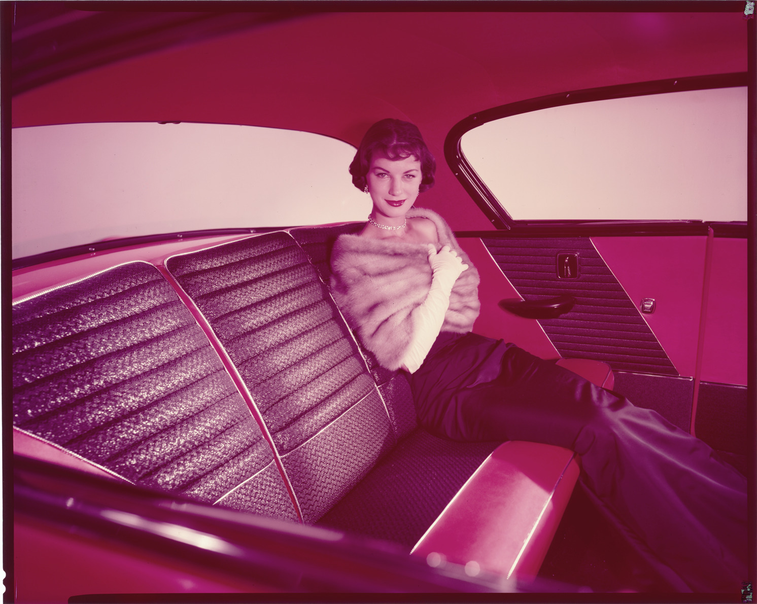 View of a woman, wearing mink stole, diamond necklace and long gloves, sitting in the back seat of 1957 Nash car. Handwritten on sleeve: "1957 Nash."