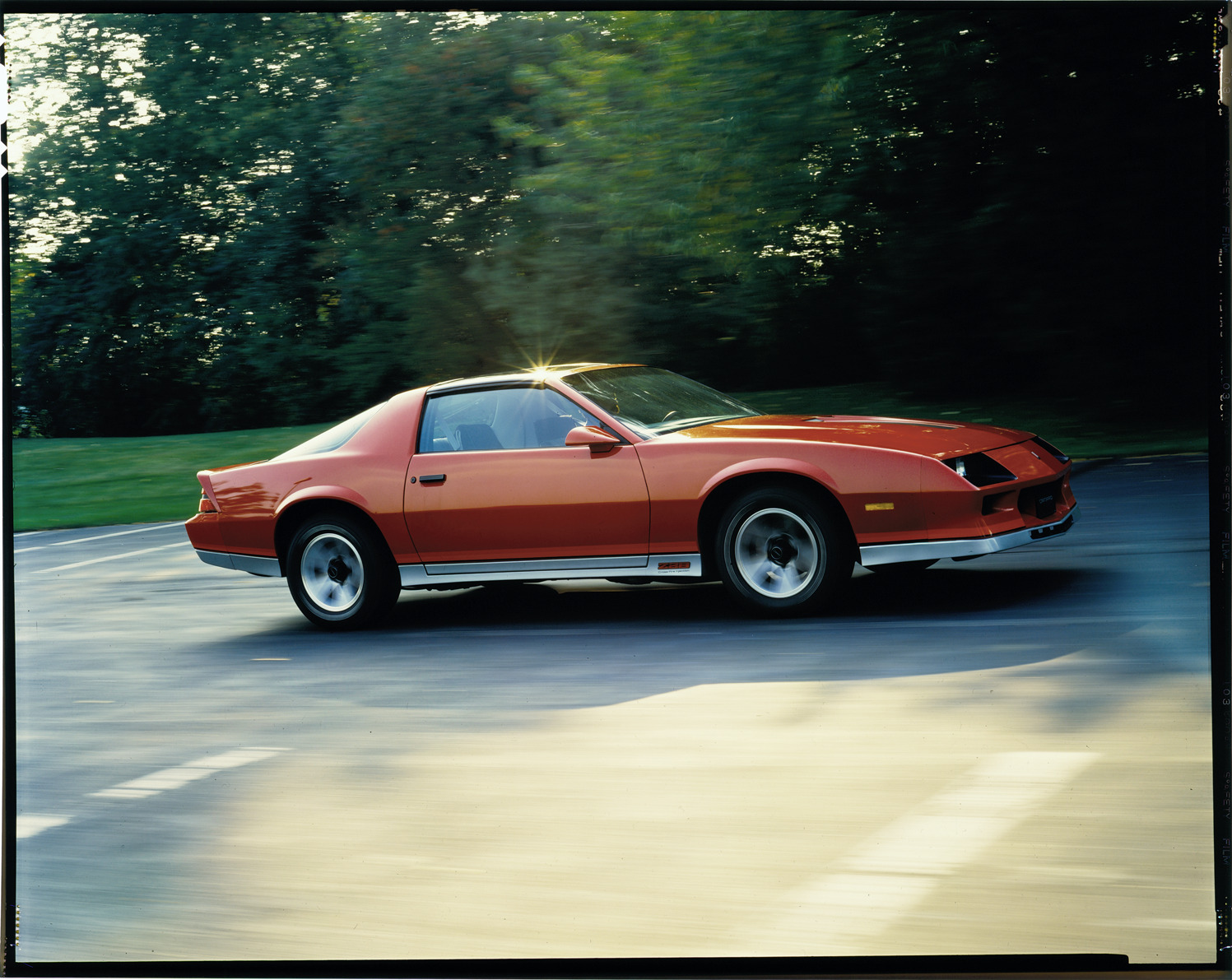 View of a 1983 Chevrolet Camaro Z28 coupe. Label on sleeve: "General Motors, Chevrolet Camaro Z28, 1983."