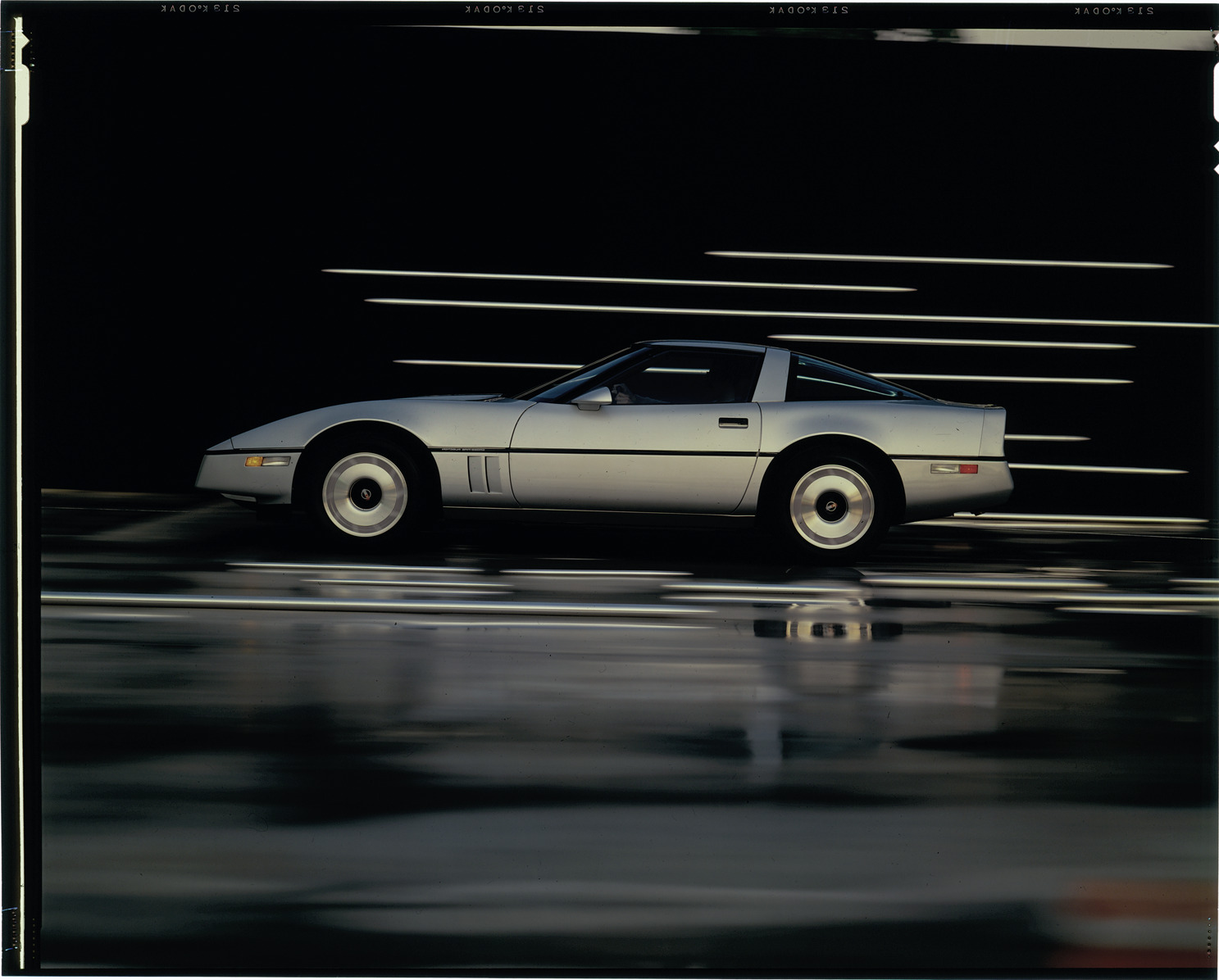 View of a Chevrolet Corvette coupe. Label on sleeve: "General Motors, Chevrolet Corvette, 1984-85."