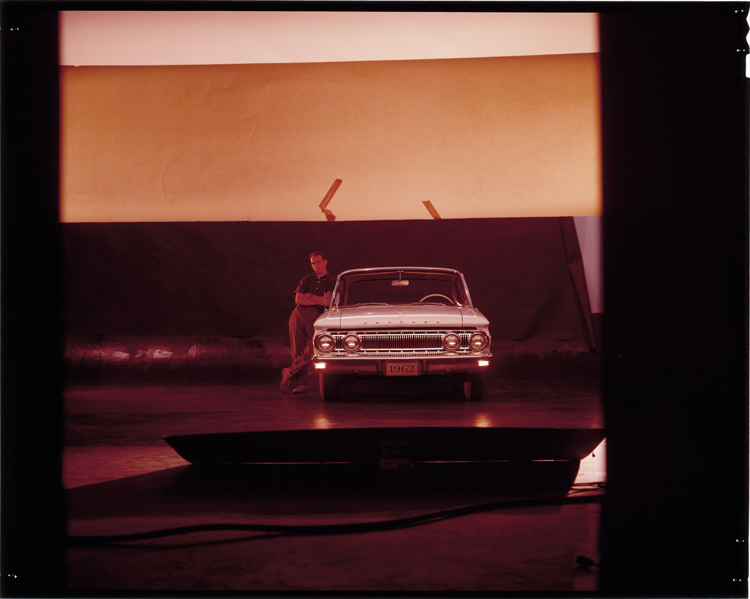 View of a man leaning on a 1962 Mercury Comet coupe. Label on sleeve: "Ford Motor Co., Mercury Comet, 1962."