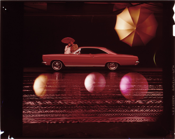 View of a man and woman holding an umbrella and posing with a 1967 Mercury Cyclone coupe. Label on sleeve: "Ford Motor Co., Mercury Cyclone, 1967."