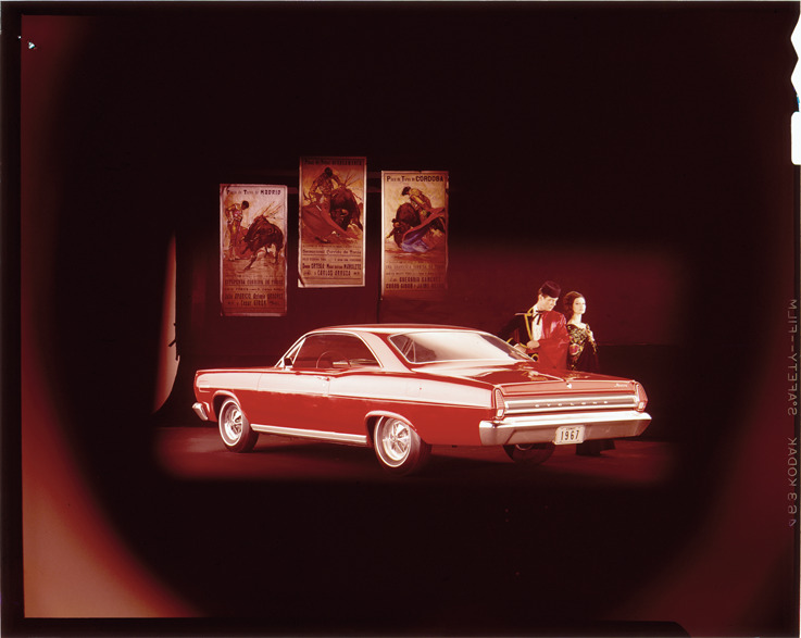 View of a man and woman posing with a 1967 Mercury Cyclone coupe. Man wears matador costume; bullfighting posters displayed in background. Label on sleeve: "Ford Motor Co., Mercury Cyclone, 1967."