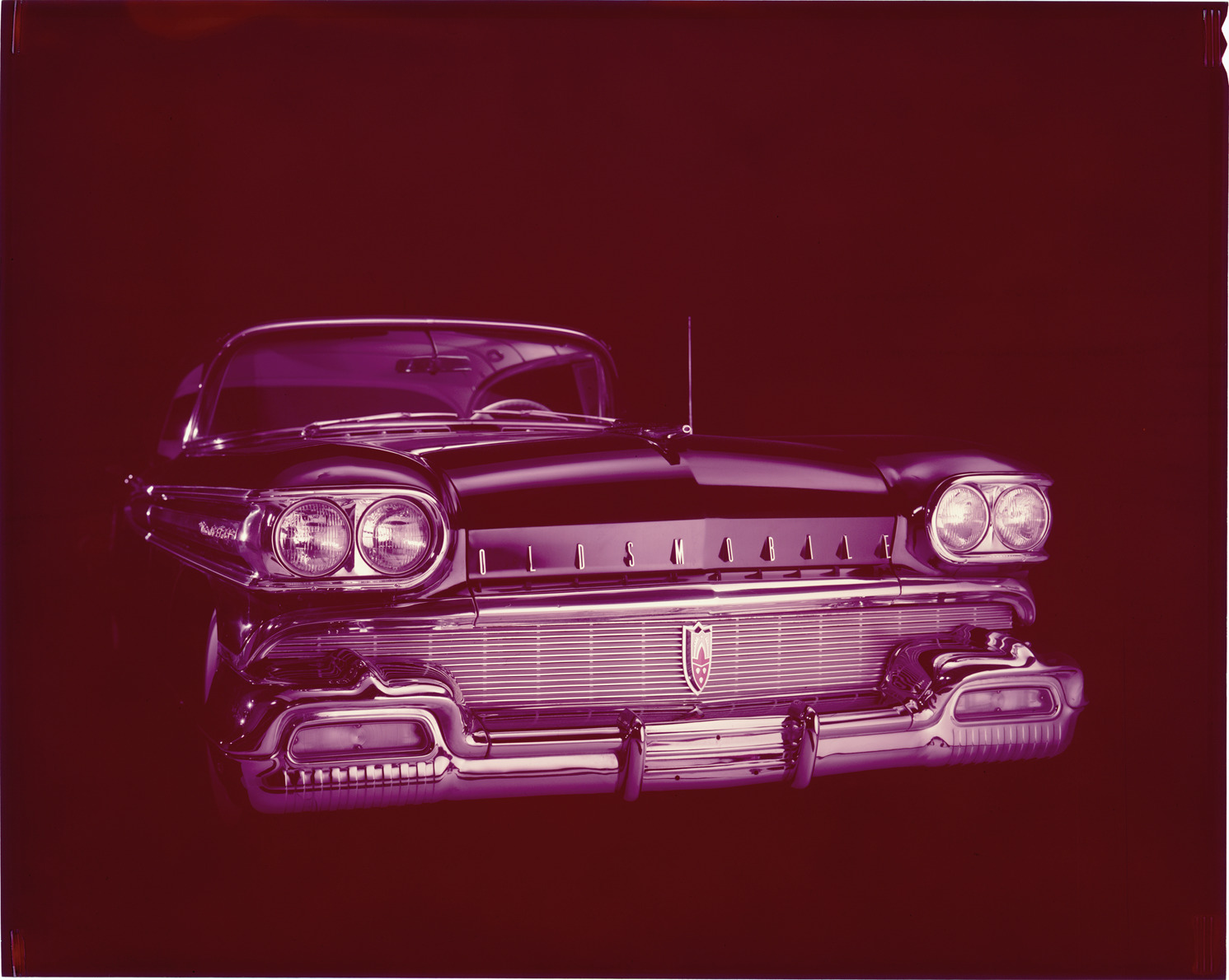 Front view of a 1958 Oldsmobile convertible, showing headlights and grille. Label on sleeve: "General Motors, Oldsmobile convertible, front end, 1958."