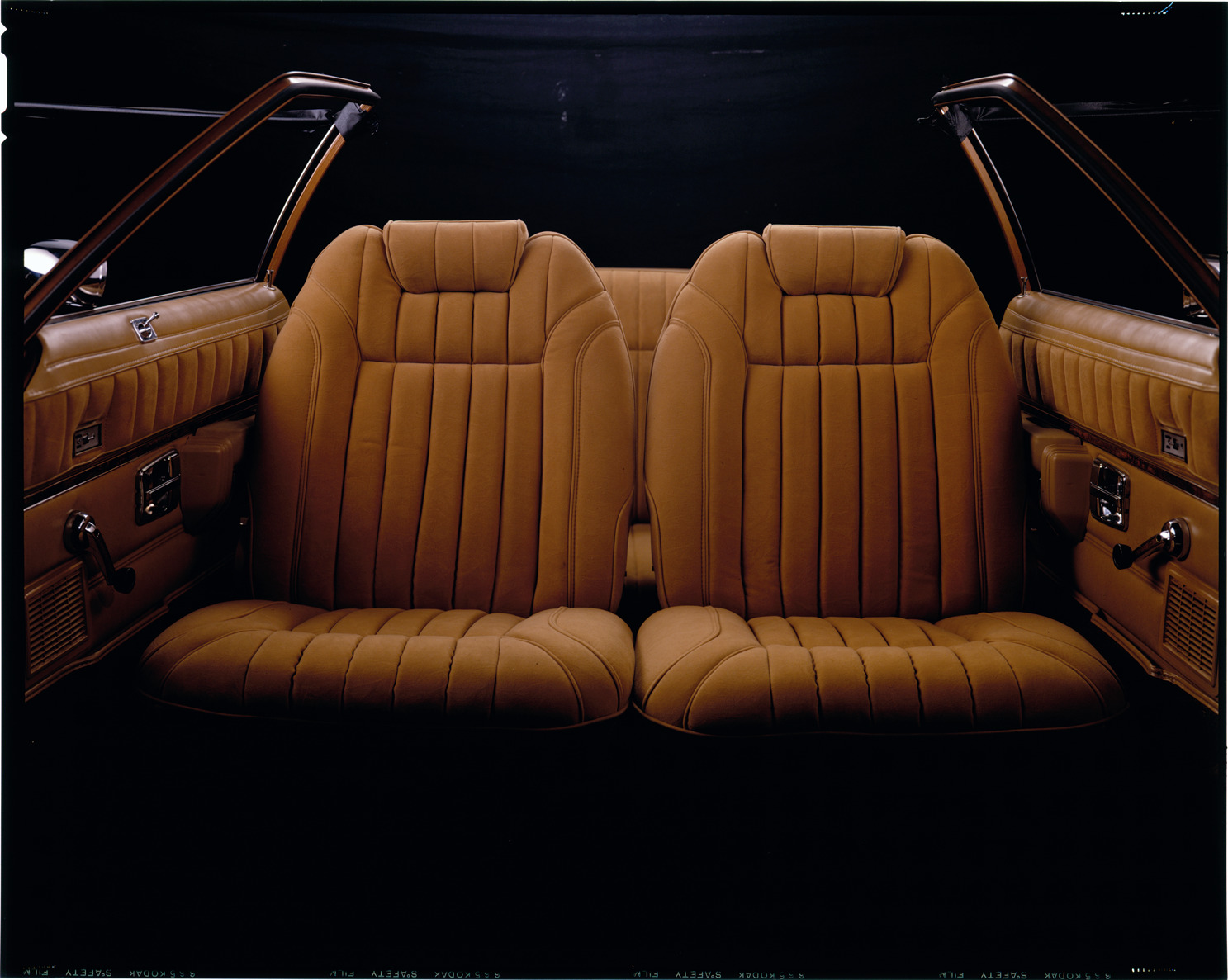View of the front seats of an Oldsmobile automobile. Label on sleeve: "General Motors, Oldsmobile, sample of seats, 1968-70."