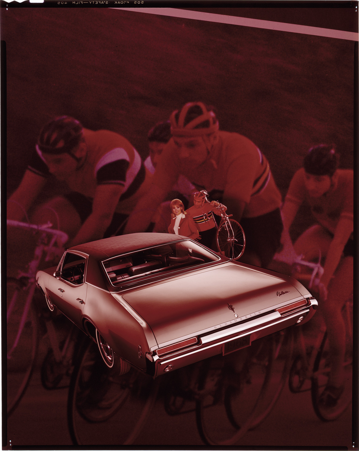 View of a woman and cyclist posing with 1968 Oldsmobile Cutlass sedan. Man holds a bicycle; image of cyclists in background. Label on sleeve: "General Motors, Oldsmobile Cutlass, 1968."