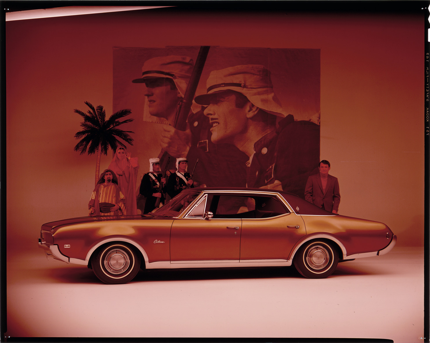 View of a man posing with a 1969 Oldsmobile Cutlass sedan. Two soldiers, man and woman in Middle Eastern clothing pose behind car; film still in background. Label on sleeve: "General Motors, Oldsmobile, Cutlass, 1969."