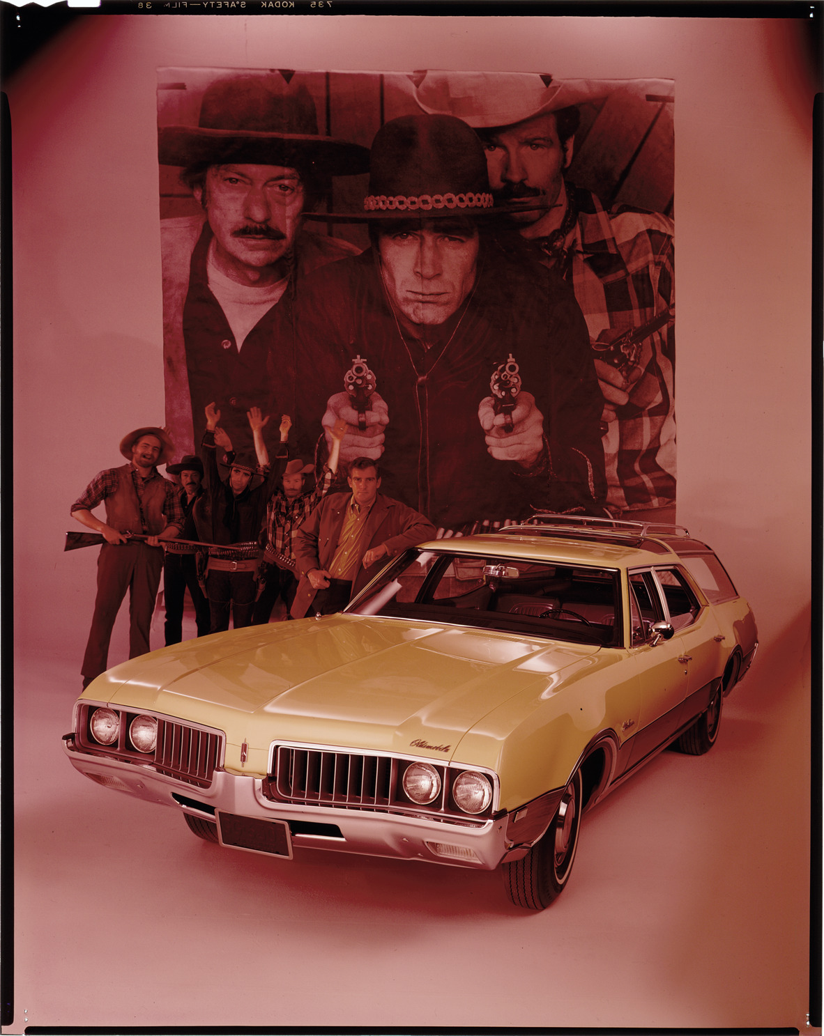 View of cowboy and bandits posing with a 1969 Oldsmobile Vista Cruiser station wagon. Man leans against car; film still of cowboys with guns in background. Label on sleeve: "General Motors, Oldsmobile, Vista Cruiser wagon, 1969."